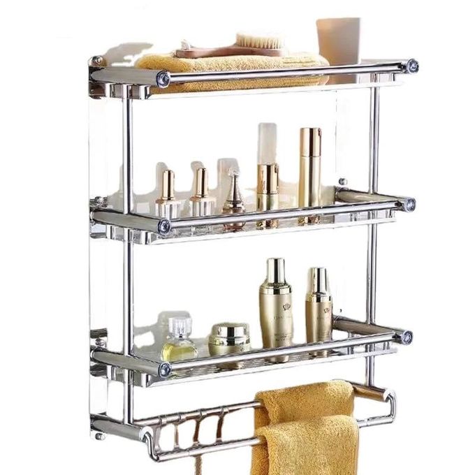 Étagère à serviettes murale sans poinçon de salle de bain, organisateur de rangement Le support de rangement a une surface lisse et un design creux, qui ne couperas pas les mains et facile a égoutter pour le maquillage, les outils de lavage et autres .Ce que le support de stockage peut vous offrir, c'est qu'il a une forte capacité de charge pour une utilisation quotidienne et qu'il n'est pas facile à déformer . Fabriquer en acier inoxydable ,il est durable .Il convient à la maison, au dortoir , a l'hôtel et au bar. Etagère de rangement de salle de bain en acier inoxydable étagère murale porte serviette accessoires de salle de bain Méthode d' installation :bâton lors de l' installation et sans trou peut